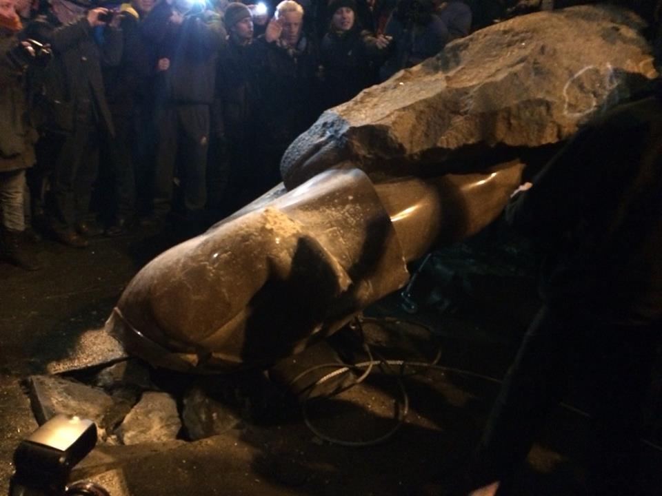 Під знесеним пам'ятником молодики скандують "Свобода прийде порядок наведе". Журналіст повідомляє, що дві групи молодиків накинули на нього троси і повалили руками донизу. Пам'ятник провалив гранітну плиту у підніжжя.