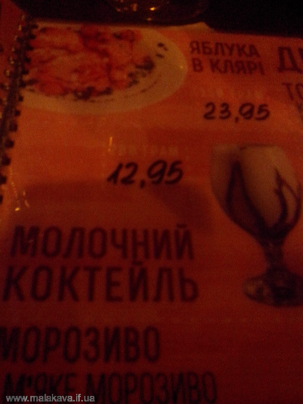 "Чомусь мені здається, - коментує Вікторія, - що в вагу входить і бокал".Вартість коктейлю - 12,95 грн. Вартість літри молока - 10 гривень.