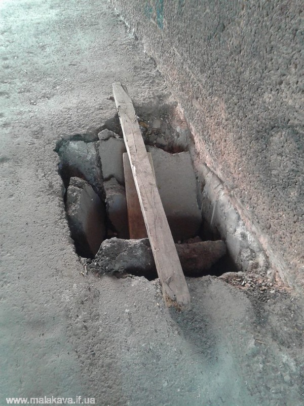 прохід під будинком, ця яма утворилася вже давно, але ніхто з комунальних служб