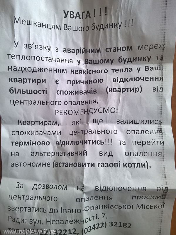 В Івано-Франківську невідомі розклеїли оголошення з рекомендацією терміново відключитися від центрального опалення.